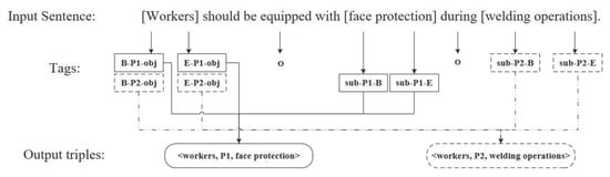 Figure 3 is an example to detail our tagger. The input sentence from outfield safety regulations is “Workers should be equipped with face protection during welding operations”. It contains two overlapped triples: <worker, perform…operations, welding operations>, <worker, be equipped with, face protection>, where “perform” and “be equipped with” are the pre-defined predicates in the schema. The words “worker, welding operations, face protection” are all related to the final extracted entities. Next, each word in the input sentence is tagged based on BIEO signs. For example, the word “face” is the first word of the object entity “face protection” and is related to the subject (sub) “worker” and predicate “be equipped with” (P1). So its tag form is . Similarly, the last word of the object entity “protection” is tagged as . All words between an entity’s first and last word are labeled as “I” (inside). Moreover, the other words unrelated to the final relational triples are labeled as “O”. We set B and E signs for each subject entity and object entity, a total of tags ( “B” tags, “E” tags, 1 “I” tag, and 1 “O” tag) are generated. The BERT-based encoding layer’s output is the tagging decoder’s input. Finally, the decoder matches the “B” and “E” signs of the subject and the object to form triples, which is performed by matching tags separated by the total number of predicates. The number of subject and object tags are doubled, so more entities and relational triples can be extracted from a sentence. More comprehensive information can also be obtained from the safety regulations.