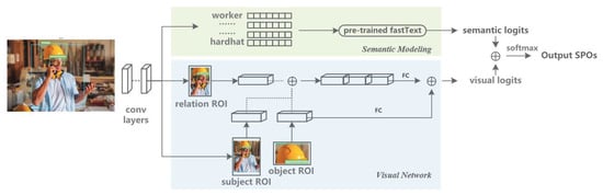 As shown in Figure 4, the logits (the unnormalized class probabilities) from the semantic modeling ( and visual network () are output through the final fully connected layer. The output logits are added and then perform softmax normalization to obtain the final probability distribution of the predicate class: