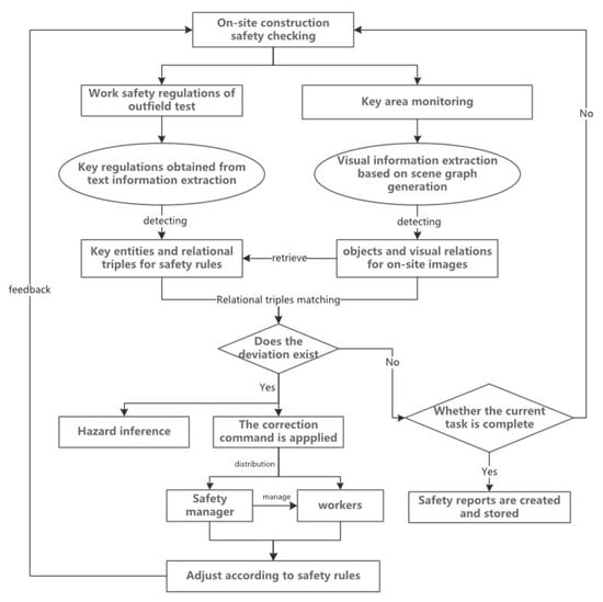 To conduct on-site safety inspections, we design an automatic control process, as shown in Figure 5. This process aims to identify any deviations between the on-site construction process and the safety regulations by comparing the visual relations output from the on-site scene graphs with the key textual relational information derived from the IE model. The correction instructions are then created and relayed to the safety managers and the on-site workers until the current production step is finished. Integrating on-site visual understanding with plain-text information extraction can make automatic safety inspections effective.