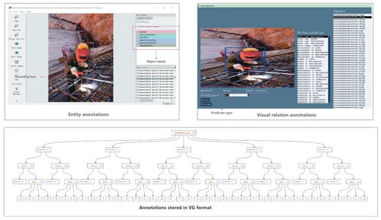 The image annotation process consists of entity annotation and relation annotation. As shown in Figure 6, the bounding box and box labels were used to identify the locations and types of entities. The subject, object, and predicate attributes were adopted to describe the visual relational triple. Finally, the entities and relations annotation results were organized into the Visual Genome [52] format to facilitate model training. As the statistics in Table 4 show, we obtained a total of 2316 visual relations annotations.
