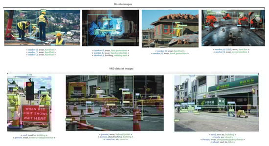 Figure 7 displays more qualitative results of our model on two datasets. Qualitative results on the self-built on-site dataset mainly showed the visual relationship between workers and PPEs. The results on the VRD dataset showed the ability of our model to extract various types of interactions such as spatial, comparative, or action-based.