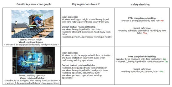 As shown in Figure 6, the critical steps of automatic safety inspection are summarized as follows: (1) scene graph generation for the key work sites, (2) key information extraction of safety rules, and (3) matching the two kinds of relational triples output from the visual and linguistic model for PPE compliance checking. Next, we conduct a case study for the specific scenes. We selected two types of work scenes to illustrate the process for safety checking and hazard inference, as shown in Figure 8.