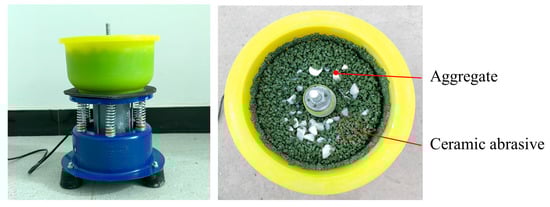 A vibration polishing machine was used to produce dolomite aggregates with different roughness (Figure 1) to explore the influence of aggregate roughness on PCT. Aggregates with different roughness (Figure 2) were prepared by adding emery with varying mesh numbers into the vibrating polisher container for polishing. The parameters of polishing are tabulated in Table 3. Given the problem that the aggregate size became smaller during the polishing process, the aggregates were sieved again after polishing.