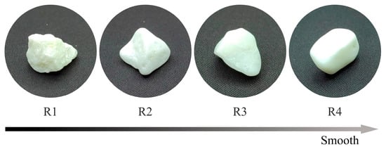 A probe-type surface roughness tester cannot measure the roughness of the aggregate well because of the complex spatial surface of the aggregate, which exceeds the equipment’s measuring range. As an emerging technology, the 3D scanner can be utilized to solve this problem because of its fast scanning speed and high scanning accuracy [33]. A DAVID SLS-2 structured light scanner was used to scan four groups of aggregates, R1, R2, R3, and R4, respectively, to obtain their high-density point cloud information for calculating the aggregate roughness. Moreover, the index Ra (the arithmetic mean deviation of the profile [34,35]) is used to characterize the roughness of the aggregate surface, as shown in Equation (1), and the calculation process of the Ra can be seen in Figure 3. First, a random cut plane is inserted into the point cloud of the aggregate. Then, the point cloud coordinates located on the cut plane are extracted and sorted clockwise. Third, a random point is selected from the extracted points as the starting point, and other points are selected clockwise as the calculation objects. When the distance between the last point and the starting point is closest to 2 mm, the Ra is calculated by all the previously selected calculation objects. Fourth, the same method can be used to calculate the Ra value of the remaining points in this cut plane. Fifth, insert a new cut plane and continue to calculate the Ra using the above method. The above steps are implemented by computer programs. In this experiment, the Ra value of a single group of aggregates is the average value after 300 times of sampling using the program. The roughness index Ra for R1, R2, R3, and R4 groups is listed in Table 3 and Figure 2. Four groups of aggregates with different roughness.