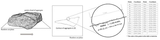 In order to obtain the perimeter of the aggregate, the general procedures of the image analysis have been displayed in Figure 5. First, photograph four cross-sections of the specimen in sequence. A bracket is used to fix the camera and provide annular lighting conditions to ensure imaging quality. Then, keep the bracket position and the camera focal length unchanged, and take a picture of a steel ruler for the next step to obtain the ratio of the actual distance to the pixel size in the picture. Second, import the pictures into the ImageJ software, and the ratio of the actual distance to the pixel size is calibrated according to the picture of the steel ruler in the previous step. Third, convert the image to an 8-bit type. Fourth, perform a threshold segmentation on the image, at which time the aggregates will be marked as a red area. Fifth, perform a binarization operation on the image; and there is some noise in the picture, which can be dealt with by smoothing and noise reduction. The black area in the picture represents aggregates, and the white area represents pores and cement paste. Finally, extract the perimeter of the black area (i.e., the perimeter of the aggregates).