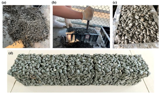The mixture proportion design of the experiment is presented in Table 4, and the cement content of all groups is 300 kg/m3. The pouring process can be summarized in two steps: the first step is to place the calculated aggregate (saturated surface dried condition) and 40% of the water into the mixer and stir for 60 s, which keeps moisture on the aggregate surface; the second step is to add the cement and the remaining water with superplasticizer into the mixer and stir for 120 s. The size of the sample mold is 100 × 100 × 100 mm. There are three main molding methods for PC: the vibration molding method, the manual poking molding method, and the static pressure molding method [36]. The manual poking molding method was used in this experiment. The production process of the specimens is shown in Figure 4. Furthermore, all samples were cured for 28 days under standard curing conditions.