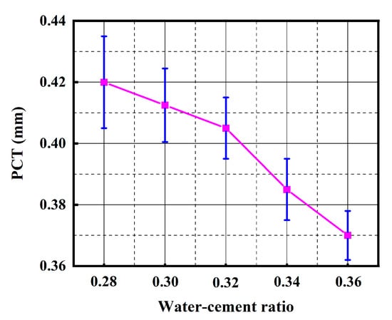 It can be seen in Figure 7 that the change in PCT with the increase in the water–cement ratio can be divided into two stages. When the water–cement ratio is between 0.28 and 0.32, the free water content in the cement paste is only slightly higher than or equal to the critical free water content, and the fluidity of the cement paste is small. Hence, the PCT slowly decreases with the increase in the water–cement ratio, which means the water–cement ratio has less influence on the PCT. When the water–cement ratio is between 0.32 and 0.36, the free water content in the cement paste gradually increases, so the PCT begins to decrease relatively quickly, which means the water–cement ratio has a certain influence on PCT.