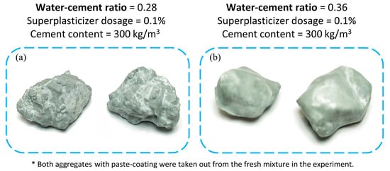 Figure 7 reflects the influence of the water–cement ratio on PCT. The PCT showed a downward trend when the water–cement ratio increased from 0.28 to 0.36. Furthermore, when the water–cement ratio is between 0.28 and 0.32, the decline of PCT is relatively slow, accounting for 30.5% of the total decline; when the water–cement ratio is greater than 0.32, the decrease is larger, accounting for 69.5% of the total decline. During the experiment (Figure 4), aggregates with their paste coating were taken out for close observation. When the water–cement ratio was low, the fluidity of the paste was poor. It can be seen that the contour characteristics of the aggregate itself are covered by the paste coating. The paste coating showed more irregular protrusions and high roughness, as shown in Figure 8a. When the cement fluidity increases due to the rise in the water–cement ratio, less cement paste can be wrapped on the aggregate surface. As shown in Figure 8b, the cement paste forms a smooth, relatively thin paste coating on the aggregate surface, and the original contour characteristics of the aggregate can be seen at this time.