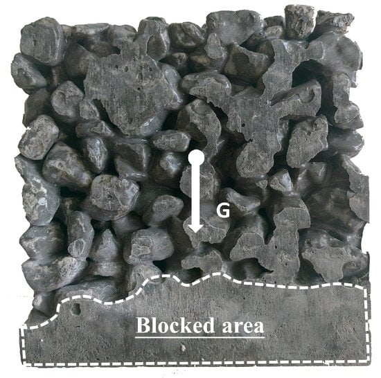 The guiding significance of this conclusion for practical engineering is that, when designing the mixture proportion of PC, it is necessary to control the superplasticizer dosage precisely. An excessive superplasticizer dosage will lead to extreme fluidity of the mixture, and the cement paste during pouring will flow to the bottom of the material because of its gravity and the vibration of the vibrating process, thereby resulting in blockage at the bottom of the material (Figure 10). On the contrary, adding too little superplasticizer is not advantageous for the workability of the fresh mixture, particularly when the water–cement ratio is low.