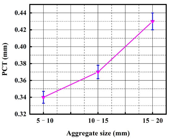 In practical projects, the aggregate size ranges from 5 mm to 20 mm [31,47]. Therefore, three types of aggregates with particle sizes ranging from 5–10 mm, 10–15 mm, and 15–20 mm were used to investigate the influence of the aggregate size on PCT. The influence of the aggregate size on PCT is shown in Figure 12. With the increase in the aggregate size, the PCT shows a gradual increase, characterized by relatively slow growth at first and then rapid growth.
