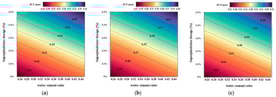 Prediction of the PCT under the change of water–cement ratio, superplasticizer dosage and aggregate size (the default aggregate roughness Ra is 342 μm). (a) aggregate size ranges from 5–10 mm; (b) aggregate size ranges from 10–15 mm; (c) aggregate size ranges from 15–20 mm.