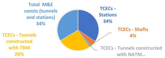 Therefore, the basis for this proposed research project is a comprehensive material quantity and cost analysis of the contract for the extension of Line 3 from Chaidari to Piraeus, which included the construction of six underground metro stations. For this contract, the total contractual construction cost, including total civil engineering construction costs (TCECs) and mechanical and electrical (M&E) installation costs, was EURO 343,960,000, excluding contingencies, unforeseen costs, and value-added tax (VAT). Figure 1 shows the distribution of costs between the major cost categories. It is easily deduced that the TCEC for the construction of the six stations is, along with M&E, the top cost category consuming 34% of the construction budget, while the actual TCEC for the tunnel network construction is in second place, accounting for 26% of the costs. This initial observation sparked an interest in determining if the issue of obtaining safe cost estimations for the planning of the construction of underground metro stations has been adequately addressed in the literature.