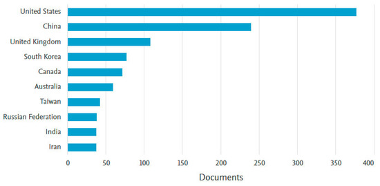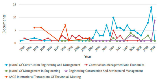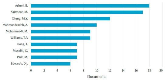 The top four journals in terms of the overall number of documents published are shown in Figure 3, along with the frequency of their publications through time. By far, the most documents published were in the ASCE Journal of Construction Engineering and Management with 107 documents, followed by Construction Management and Economics with 44, the ASCE Journal of Management in Engineering with 26, and Engineering Construction and Architectural Management with 25. In addition, the top 10 authors involved in the investigation of construction cost estimates are shown in Figure 4, while the top 10 countries are shown in Figure 5.