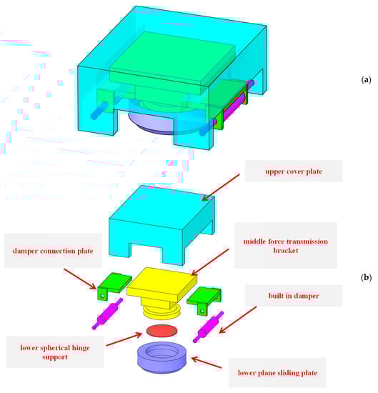 Under vertical pressure, the CDHB transmits successively more force to the bottom case through the upper cover plate, upper sliding plate, middle force transmission bracket, and lower spherical support unit. Because the gaps between its components are tiny, the CDHB has good compression properties. Moreover, the force transmission path of the vertical tension is the same as the path of the vertical pressure, with an opposite force transmission direction. When the clips between the upper cover plate and the middle force transmission bracket and the clips between the middle force transmission bracket and the upper section of the bottom case are fastened firmly, the CDHB will display good tension properties. Under horizontal loading, the CDHB’s upper cover plate will have a translational displacement in the plane, which deforms the built-in dampers axially, and makes the CDHB rotate around the bottom case, producing a rotation angle.