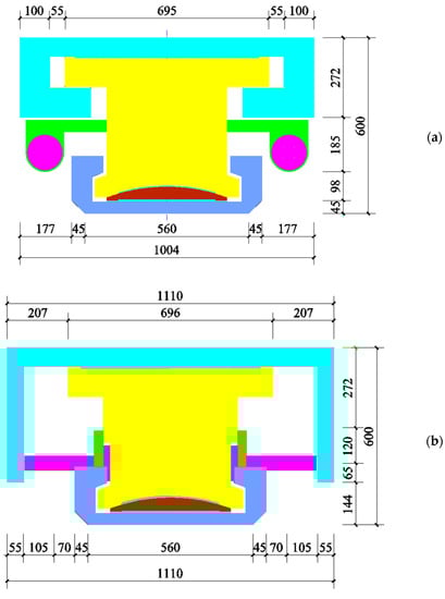 Geometric dimensions of the tested CDHB: (a) perpendicular to the axis of the built-in damper and (b) along the axis of the built-in damper.