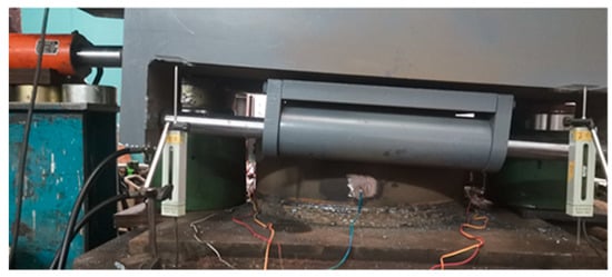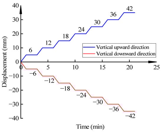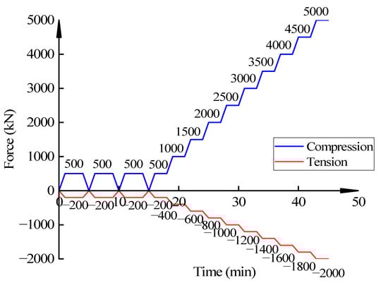 To study the bearing capacity of the CDHB under compression and tension, we have carried out the loading capacity test of the CDHB according to the spherical bearings for steel building structure (GB/T 32836-2016) []. When loading, take 10% of the maximum vertical loading of the test as a level difference and carry out the horizontal loading test with ten levels. Figure 7 shows the loading scheme of the CDHB’s vertical compression and tension deformation test.