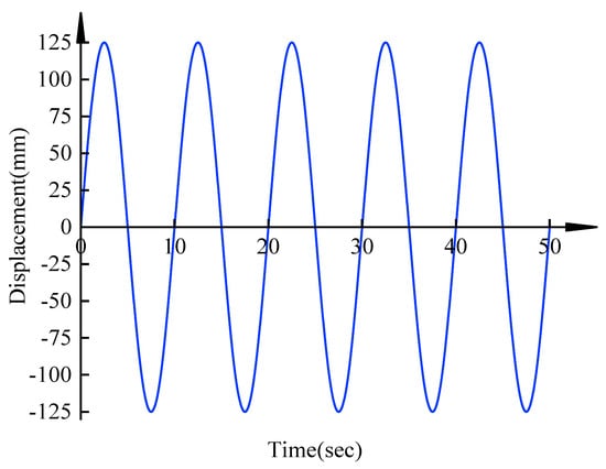 We have performed the axial tensile and energy consumption performance tests to measure the built-in dampers’ mechanical properties. Both tests comply with the technical specification for seismic energy dissipation of buildings (JGJ297-2013) [] and dampers for vibration energy dissipation of buildings (JG/T 209-2012) []. In the ultimate displacement test, we apply the experience record test method with the movement rate of the MTS loading system at controlled at 1 mm/s. Then, we record the ultimate displacement of the fore-and-aft motion. In the maximum damping force test, we use the sinusoidal excitation method and apply a sinusoidal force with displacement u = u0·sin(2πft) and displacement amplitude u0 = 125 mm, according to the sinusoidal law. The loading frequency f is 1 Hz. Following five successive testing cycles, we use the recorded maximum damping force corresponding to the third cycle as its measured value. Figure 9 shows the loading scheme. In the test of the damping constant and damping coefficient, we use the sinusoidal excitation method and apply a sinusoidal force with displacement u = ui·sin(2πft), and displacement amplitudes UI of 0.1 times, 0.2 times, 0.5 times, 0.7 times, 1.0 times, and 1.2 times of u0, respectively. A total of five test cycles have been carried out successively. During each cycle, we draw the damping force-displacement hysteresis curve. Furthermore, under each working condition, we calculate the damping constant and damping coefficient corresponding to the third cycle and use the results as their measured values. We also apply the same sinusoidal excitation method mentioned in the tests under different frequencies. According to the sinusoidal law, we apply a sinusoidal force with displacement u = u0 sin(2πft) and loading frequencies f of 1.0 times, 1.3 times, 1.6 times, 1.9 times, and 2.1 times of f1, respectively, to obtain the maximum damping force under different frequencies.