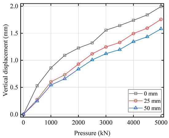 Figure 10 shows the CDHB’s pressure-displacement curves under different initial horizontal displacements. From Figure 10, the pressure-displacement curves of the CDHB are linear under different initial displacements. When the initial displacement changes from 0 mm to 25 mm to 50 mm, the vertical compressive stiffness of the CDHB decreases accordingly, with the maximum vertical displacements of 1.99 mm, 1.77 mm, and 1.59 mm, respectively. It can be seen that within the design range of vertical pressure, the CDHB is basically in an elastic state, the vertical deformation increases linearly with the increase of pressure, and under the same vertical pressure, the CDHB’s vertical deformation decreases with the increase of initial displacement.