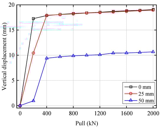 Figure 12 shows the CDHB’s tension-displacement curves under different initial horizontal displacements. Figure 12 also shows that the CDHB’s tension-displacement curves all present a double-fold line pattern. At the initial stage of tension application, the CDHB’s vertical displacement increases rapidly. Following the inflection point, the curves tend to flatten. The maximum vertical displacements of the CDHB is 19.07 mm, 18.96 mm, and 10.66 mm, respectively, under the initial horizontal displacement of 0 mm, 25 mm, and 50 mm. It shows that because of the gap between the middle force transmission bracket and the bottom case, the CDHB’s initial vertical displacement increases rapidly under the action of tension. When the initial horizontal displacement reaches 50 mm, that gap decreases, which makes the vertical displacement under this horizontal displacement more minor than the displacements under the other two conditions. When the CDHB’s cover plates attach closely to each other, the CDHB is basically in an elastic state, and its tensile stiffness under different initial displacements does not vary.