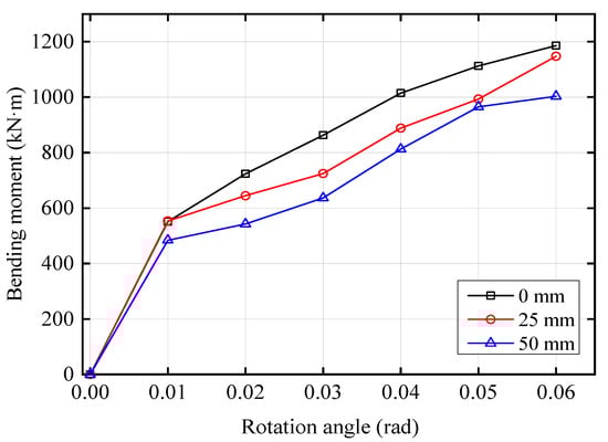 Figure 16 shows the rotation angle-bending moment curves under different initial horizontal displacements when the CDHB is under the action of vertical tension. Figure 16 also shows that under different initial horizontal displacements, the rotation angles can all reach 0.06 rad, and the rotation angle-bending moment curves are all linear. The CDHB’s bending moment decreases when the initial displacement changes from 0 mm to 25 mm to 50 mm, with the maximum bending moment of 1190 kN·m, 1150 kN·m, and 975 kN·m, respectively. It shows that under vertical tension, the CDHB has a good rotation performance. With the increase of the initial displacement, the CDHB tends to rotate more easily.