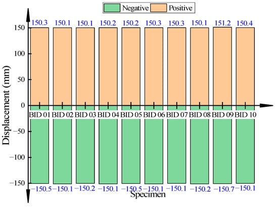 Figure 18 presents the test results of the ultimate displacement of the built-in dampers (from BID 01 to BID 10). From Figure 18, we can see that the measured positive mean of the built-in dampers’ displacement is +150.31 mm, while the measured negative mean is −150.66 mm. Both are more than 1.2 times the design stroke (±150 mm). It shows that when the viscous damper is scaled down by a large proportion, its ultimate displacement is quite stable, which can meet the requirement of the bearing sliding 100 mm in one direction.
