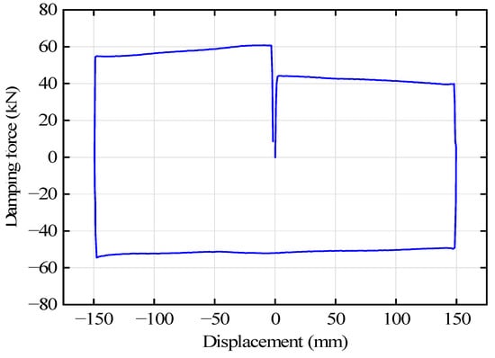 The ultimate displacements of individual testing parts are close to each other. Take the BID 03 testing section as an example. Figure 19 presents the ultimate displacement-damping force curve corresponding to the BID 03 testing section. Figure 19 shows that the positive ultimate displacement of the BID 03 testing section is 150.1 mm, while its negative ultimate displacement is −150.2 mm.
