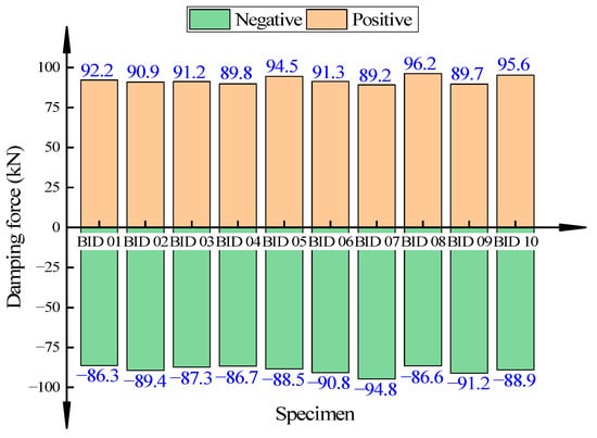 Figure 20 shows the test result of the maximum damping force of the built-in dampers of BID 01 to BID 10. It shows that the maximum damping force of all built-in dampers is 96.2 kN, which meets the standard that the deviation of the measured maximum damping force should be within ±15% of the product design value. The average value of the damping forces is 90.5 kN, which meets the standard that the deviation of the average value of the measured damping forces should be within ±10% of the product design value. We can see that when the viscous damper is scaled down by a large proportion, its maximum damping force is quite stable, and a single bearing can provide a damping force of about 180 kN along the direction of the dampers.