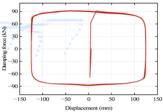The maximum damping forces of the individual testing parts are close to each other. Take the BID 03 testing section as an example. Its displacement maximum damping force curve is shown in Figure 21. Figure 21 also shows that the maximum damping force of the BID 03 testing section is 91.2 kN.
