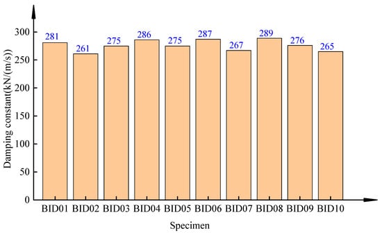 Figure 22 shows the damping constants C of the built-in dampers of BID 01 to BID 10. Figure 22 also shows that the average value of the built-in dampers’ damping constants is 276.2 kN/(m/s), and the maximum value is 289 kN/(m/s), with a deviation of 4.6%, which is below the allowable deviation of 15%. It shows that when the viscous damper is scaled down by a large proportion, its damping constant is quite stable.