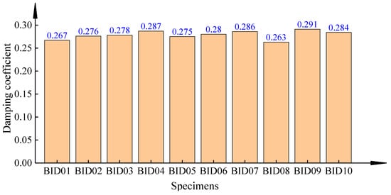 Figure 23 presents the damping coefficients 𝛂 of the built-in dampers of BID 01 to BID 10. From Figure 23, we can see that the average value of the damping coefficients of the built-in dampers is 0.2787, and the maximum value is 0.291, with a deviation of 4.4%, which is below the allowable deviation of 15%. It shows that when the viscous damper is scaled down by a large proportion, its damping coefficient is quite stable.