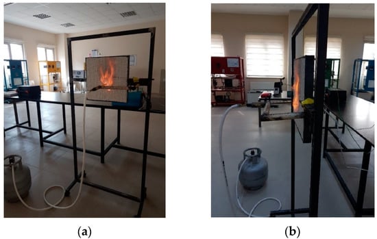 During the test (Figure 2), the flame was kept at a constant temperature of 900 °C and at a distance of 3 cm on one side of the plasterboards for 180 min. At the same time, the change of temperature on the back side of the test plates was measured at two points. The temperature readings of the thermocouples were taken at 5 min intervals.