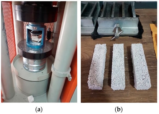 In order to determine the mechanical properties of the plaster, compressive strength tests were performed (Figure 4a) on the test samples (Figure 4b), according to ASTM C39. It was observed that the compressive strengths varied between 4 and 5 MPa. These values are also quite high compared to other insulation materials.