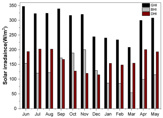 The monthly average of the daily direct, global and diffuse horizontal solar radiation is presented in Figure 4. The global (GHI) values ranged from 208.1 W/m2/day in March to 346.9 W/m2/day in June, the diffuse (DHI) values varied between 114.7 W/m2/day in December to 202.1 W/m2/day in July, while the direct (BHI) values spanned from 54.0 W/m2/day in March to 200.2 W/m2/day in November. Due to the lengthy duration of daytime in the summer and the high solar altitude, the GHI from June to September was higher than in other months. By contrast, the short length of the days in the winter, the low solar altitude, and the unstable weather conditions in the spring were mostly responsible for the low GHI from December to March. Furthermore, there was a high proportion of the diffuse component in the months with low GHI (i.e., January to March). Lastly, the annual average GHI, DHI and BHI were 291.8 W/m2/day, 164.6 W/m2/day and 127.2 W/m2/day, respectively.