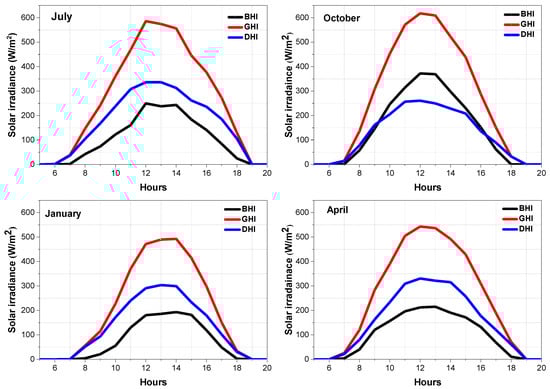 Figure 5 shows the monthly hourly solar radiation for January, April, July and October, representing winter, spring, summer and autumn, respectively. The peak GHI appeared at noon for July and April. In October and January, the peak GHI was found at 13:00 and 14:00, respectively. Furthermore, there was a significant difference between BHI and DHI in the other months. For example, the BHI was greater than the DHI in October. This was likely due to the clear sky usually experienced during autumn. By contrast, April has more DHI than BHI. This finding was due to the cloudy and unstable sky conditions in the spring season.
