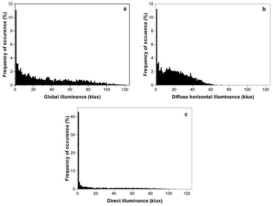 Frequency of occurrence of (a) global-, (b) diffuse- and (c) direct illuminance.