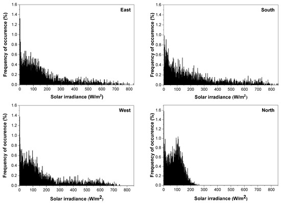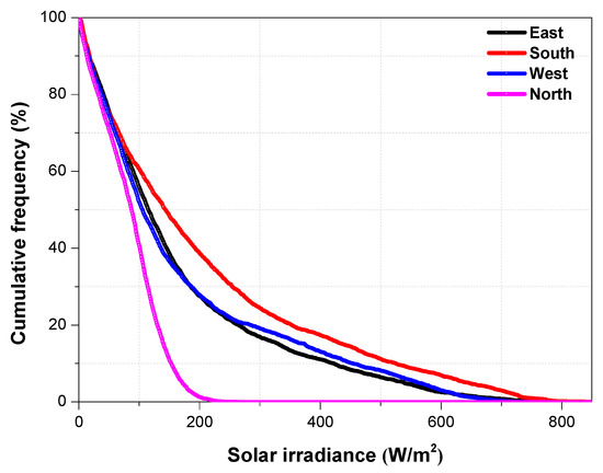 Figure 8 and Figure 9 present the FOC and CF of the global solar radiation (GVT) on the four principal vertical surfaces (i.e., N, E, S and W). Similarly, Table 3 provides descriptive statistics of GVT. Figure 8 and Table 3 show that the maximum solar radiation of 847.3 Wh/m2 was found on the south surface. The north surface has its maximum value at 261 Wh/m2, which is less than half the maximum solar radiation on other surfaces. The mean values also ranged from 205.9 to 84.3 Wh/m2 for the south and north surfaces. A key finding from the CF in Figure 9 is that about 90 Wh/m2 or more is experienced for more than 50% of the year. This value was attributed to Hong Kong’s high solar altitude during the mid-season and summer.