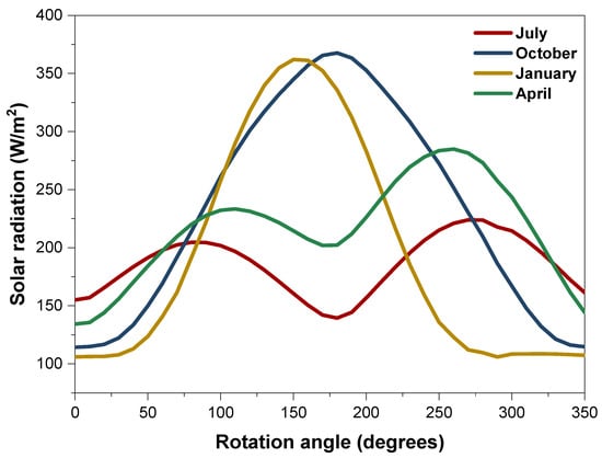 Figure 13 presents the monthly average incident GVT for the seasonal representative months as a building is rotated clockwise from 0 to 350 degrees. It was observed that the summer and spring months (i.e., July and April) had similar sinusoid-shaped solar radiation patterns. Two peak values, at 80° and 270° for July and 110° and 260° for April, were also noticed. The lowest solar radiation was found along the north surface (i.e., 0°) for April and the south (i.e., 180°) for July. Similarly, the autumn and winter months (i.e., October and January) were investigated and showed a similar Gaussian-shaped solar radiation pattern. The highest solar radiation was found at 180° for October and 150° for January. Furthermore, the lowest solar radiation was found at 0° for October and 290° for January. It was deduced that for individual months and seasons, the maximum average solar radiation might not be derived on the south surface, which typically has the highest amount of solar radiation. Similarly, other unconventional surfaces, in addition to the four principal surfaces, can provide high solar radiation for BIPV. These findings also have passive design implications. For example, there is more solar heat gain (Q) when a building is oriented towards the south in the autumn and winter seasons. However, Q may be relevant for increasing the indoor temperature during cool seasons. This increase in temperature improves the thermal conditions of rooms and might reduce the cost of warming up spaces. Similarly, the north orientations have low Q in cool seasons. Nevertheless, the possibility of space heating is eliminated, increasing the energy spent on heating. For the summer months, the south orientation provides less Q, which is preferable for indoor cooling. Moreover, solar shading is required in summer and spring if its orientation is towards the northwest. In practice, in addition to properly orientating the building, passive solar designs involve planning and orientating spaces within the building to harness or eliminate Q.
