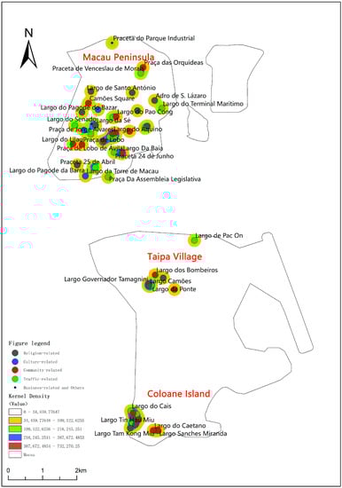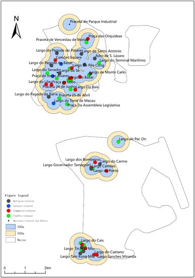Based on field research and according to the existing functional attributes of Largos, the 57 Largos can be divided into six categories: community-related, traffic-related, culture-related, religion-related, business-related and other types. The main functions of Largos are to serve the community, ease traffic and promote religious culture (Table 1). To understand the distribution of Largos, their latitudes and longitudes were visualized using GIS software. Additionally, kernel density estimation was performed. The Largos were found to be distributed mainly in the Macau Peninsula, Taipa Village and Coloane Island (Figure 5). These three areas were the main living places of Macau residents before the reclamation of Macau. Therefore, it can be assumed that the density of the foreland is necessarily related to the daily life of the citizens. In addition, the Largos were used as the sampling sites to set up a 300 m buffer zone [24], occupying an area of 9.1 km2 and accounting for 65.266% of the total Macau Peninsula area. The 500 m buffer zone would cover the entire Macau Peninsula (Figure 6). The number of Largos in the Macau Peninsula is large and densely distributed, and the samples are typical; thus, the Macau Peninsula was chosen as the research focus of this paper (Figure 7).