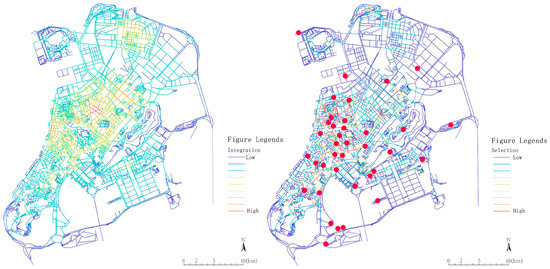 First, the axial model was established based on an electronic map provided by the Cartography and Cadastre Bureau of Macao SAR. The urban space system is summarized as an axial model, which is generally used in the study of street layouts or large-scale urban networks. The axes have dual functions, including both visual perception and motion state. The space syntax theory stipulates that the longest axis shall be used to cover the entire spatial system. Each axis is regarded as a node. Syntactic computation was performed according to the handover relationship between nodes. Finally, different colors were used to indicate the level of syntactic variables of each axis [20,25].