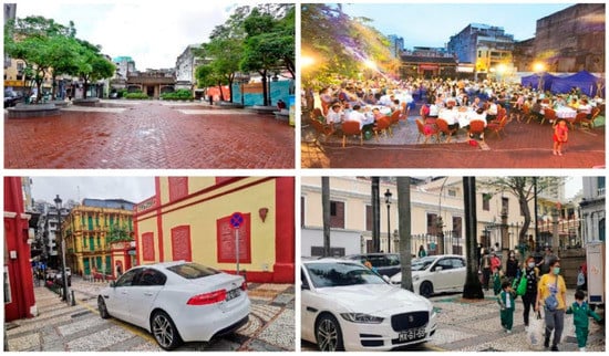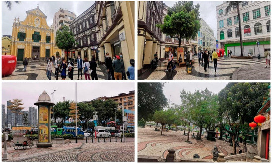 Earlier studies promoted the cultural value of Largos by exploring their role in promoting tourism [6]. In the process of urban development, the landscape environment and original functions of some Largos have been substantially destroyed and reduced into open-air parking lots, which are spaces without character and sense of place [7]. Some Largos have disappeared, leaving only their names. In the face of such challenges, the government and design authorities have undertaken a sustainable transformation of Largos in important locations [8]. Among them, Largo do Senado and Largo da Sé have been successfully renovated and reused, forming the Macau Model for Urban Rehabilitation and Revitalization (MMURR) [9]. They provide a model for design of the reuse of public spaces in the historic center of the city [10,11]. Largos are rich in physical form and surrounded by brightly colored stucco buildings, and with its exquisite patterns, the Portuguese gravel road has a unique urban imagery [12]. Some scholars explored the spatial characteristics of Largos by using typological analysis and sample studies [13]. In addition, multiculturalism has also had a profound impact on Largos, whether it is a church foreground where Western rituals are held or a temple foreground where traditional culture is passed down, both of which carry rich intangible cultural information [14,15]. Overall, these studies of Largos mainly focus on exploring the value of humanities and arts as represented by Largos [16]. In addition, they analyze the design of space transformation, the protection of cultural heritage and similar aspects.