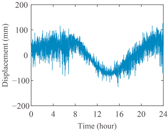 The health monitoring system is critical in civil infrastructure maintenance, including building, hydraulic, road and bridge engineering, etc. [21,22,23]. The structural health monitoring system installed on long-span bridges provides a good platform for studying the longitudinal movement of stiffening girders [24,25]. Figure 1 shows a typical 24-h displacement curve at the girder end of a long-span suspension bridge, which was captured by the structural health monitoring system. The suspension bridge taken into account here is a 1385 m single-span suspension bridge. It is noteworthy that the measured date was captured when no longitudinal dampers were installed on the bridge. The sampling frequency is 1 Hz.
