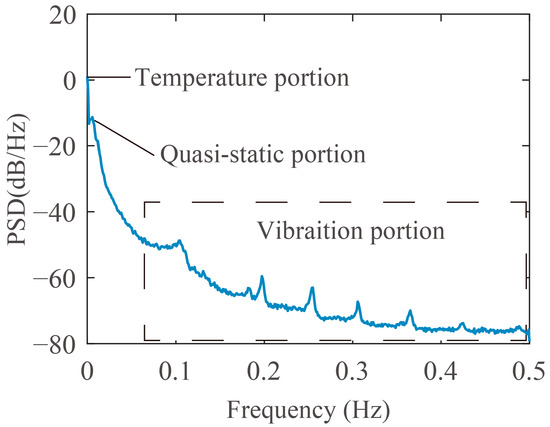 Firstly, the trend portion caused by the daily temperature variation changes only once in a 24 h period. This portion, proportional to the temperature, possesses the lowest predominant frequency. The frequency is 1/86,400 Hz because the daily temperature change period is 24 h (86,400 s) [26,27]. Secondly, the vibration portion scatters in a wide frequency band. This frequency band corresponds to the natural frequencies of the suspension bridge. This portion has the highest predominant frequencies and lowest amplitudes. Thirdly, the quasi-static portion, named for its relatively low predominant frequency, has a high peak value. This portion has a narrower frequency band and higher amplitude than the vibration portion.