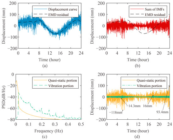 Figure 3d shows the quasi-static and vibration history curve in the time domain. The two portions turn out to have different displacement amplitudes. The maximum and minimum values of the quasi-static portion are 93.4 and −118 mm, respectively. The maximum and minimum values of the vibration portion are 16 and −14.3 mm, respectively.