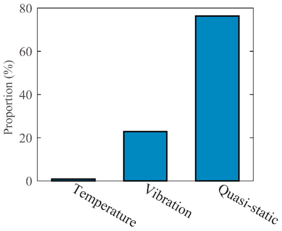 Herein, the difference between the maximum and the minimum of the vibration portion, 30.3 mm (16 + 14.3 mm), is set as the boundary of the quasi-static portion and the vibration portion. The cycles with a peak-to-peak value bigger than 30.3 mm are regarded as quasi-static movement, and the other cycles are regarded as vibration movement. Obviously, this is a conservation boundary division criterion. The peak-to-peak value of the quasi-static portion will also be less than 30.3 mm. However, the cumulative longitudinal displacement statistics in this context are presented in Figure 5, and it can be seen that the quasi-static movement already contributes almost 80% of the cumulative longitudinal displacement.