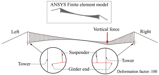 As the quasi-static movement is supposed to be induced by the vertical vehicle loading, a vertical loading of 2000 kN is assumed to be located at the right 1/4 span. According to Figure 7, significant longitudinal displacement occurs at the girder ends due to the deformation of the whole structural system of main cables, suspenders, and the stiffening girder. This formation mechanism of longitudinal displacement is often neglected when discussing the girder vibration problem of long-span suspension bridges.