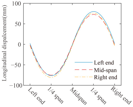 One step further, the linkage between the formation mechanism of longitudinal displacement and quasi-static movement is illustrated. The longitudinal displacement influence lines are constructed when the vertical force moves from the left end node to the right end node. The influence lines of the left, mid-span, and right end nodes are plotted in Figure 7. The girder moves as a whole in the longitudinal direction. Moreover, the girder’s longitudinal displacement oscillation cycle can be observed when the vertical force moves from the left to the right.