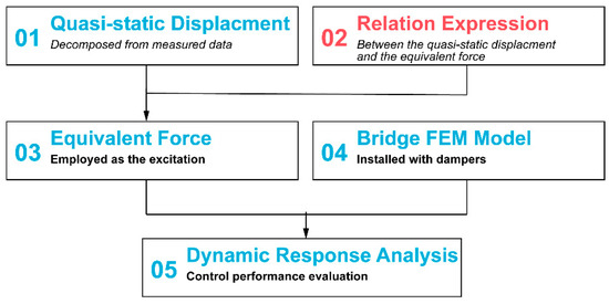 The novel quasi-static displacement response analysis procedure flowchart is presented in Figure 8. It can be seen that the vital step is obtaining an equivalent force based on the quasi-static displacement history curve decomposed from the measured data. The foundation of obtaining an equivalent force is deriving the relation expression between the quasi-static displacement and the equivalent force.