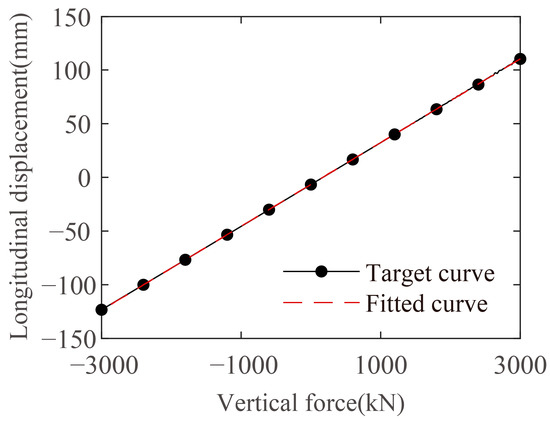 where is the longitudinal displacement at the left girder, and is the equivalent vertical force. The target curve and the fitted curve are plotted in Figure 10. The coefficient of determination of this curve fitting, namely, the R2 value, is calculated to be 0.999987. It can be seen that the two curves match very well.