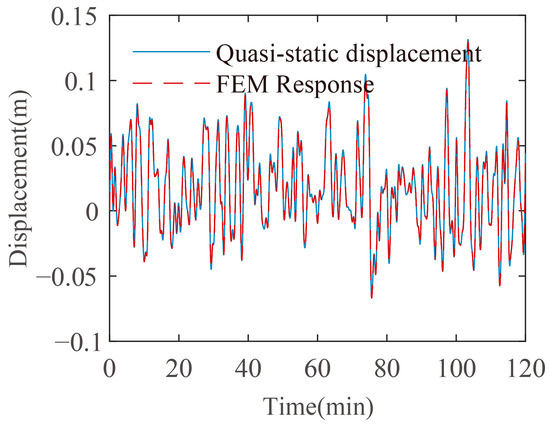 The correlation coefficient was employed to assess the linear dependence of the two curves. The mean absolute percentage error (MAPE) value of the two curves is 7.5%. It indicates that the longitudinal displacement induced by the equivalent force matches well with the quasi-static displacement decomposed from measured data. The quasi-static displacement response analysis becomes much more efficient when the equivalent force is utilized.