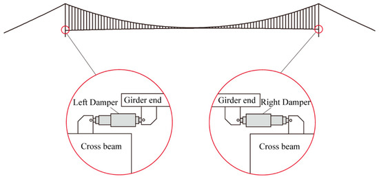 where is the quasi-static displacement control ratio, is the cumulative longitudinal displacement at the left girder end without dampers, and is the cumulative longitudinal displacement at the left girder with dampers. The higher the control ratio, the better the control performance. The schematic of the suspension bridge and dampers is plotted in Figure 12.